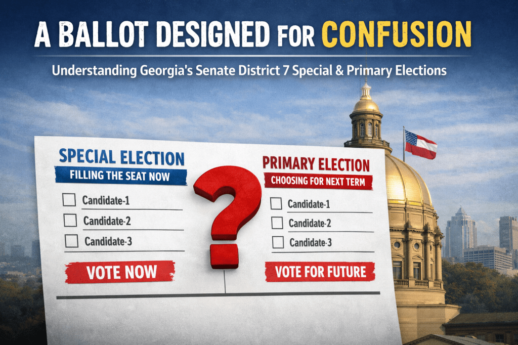 In Georgia State Senate District 7, voters are being asked to do something unusual: vote for the same office twice on the same day. One vote fills the seat immediately through a special election, while the other determines party nominees for the next full term through a primary. While technically sound from a legal standpoint, this structure creates a high likelihood of voter confusion—and that confusion has real consequences.